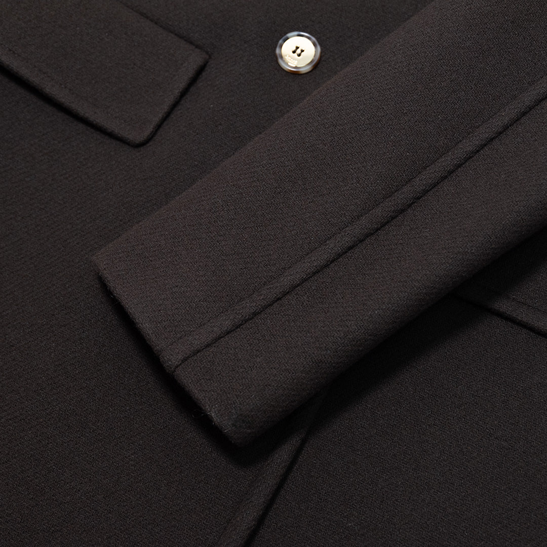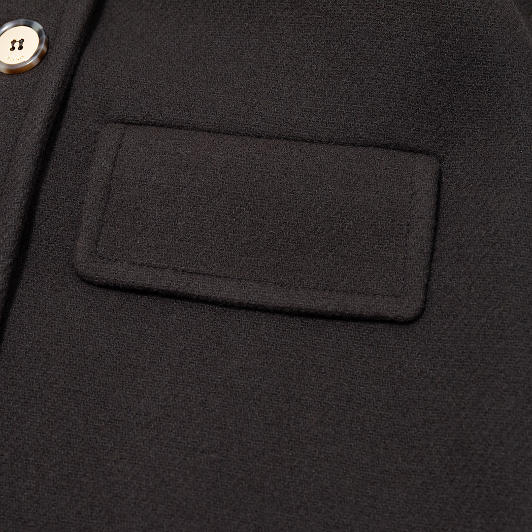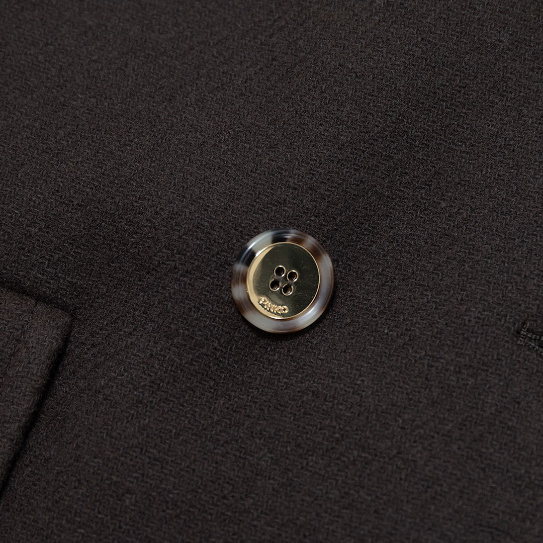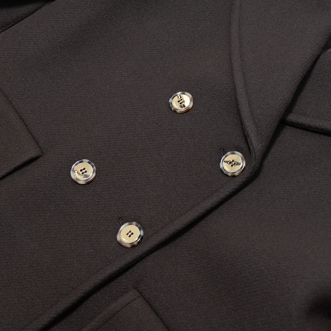 Chiusura frontale a doppiopetto con bottoni e cintura dello stesso tessuto.