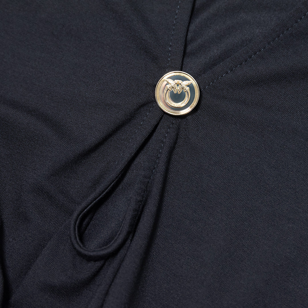 Scollo frontale a V impreziosito dal bottone logato color oro.